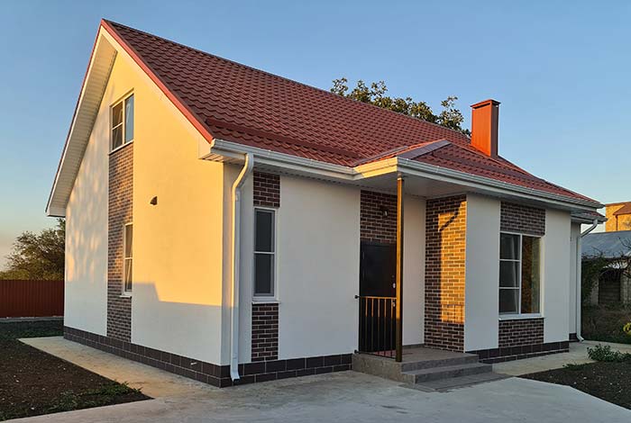 Фундамент, стены, крыша, утепление крыши, распределение коммуникаций (вентиляция, электропроводка, канализация, х\г вода, система отопления), утепление наружных стен, наружная отделка (облицовочный кирпич, декоративная штукатурка), отмостка вокруг дома, крыльцо, чистовая стяжка пола)